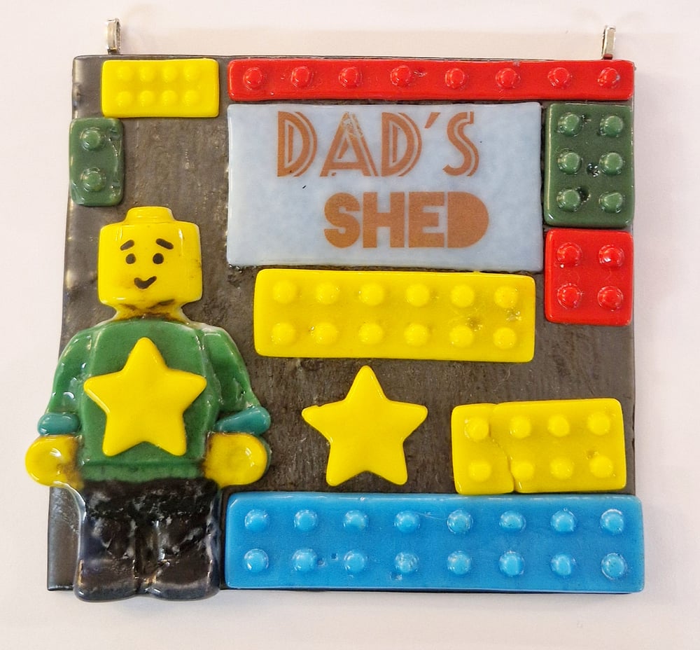 Fused Glass Sign with Fused Lego Style Man and Bricks and 'Dads Shed'.