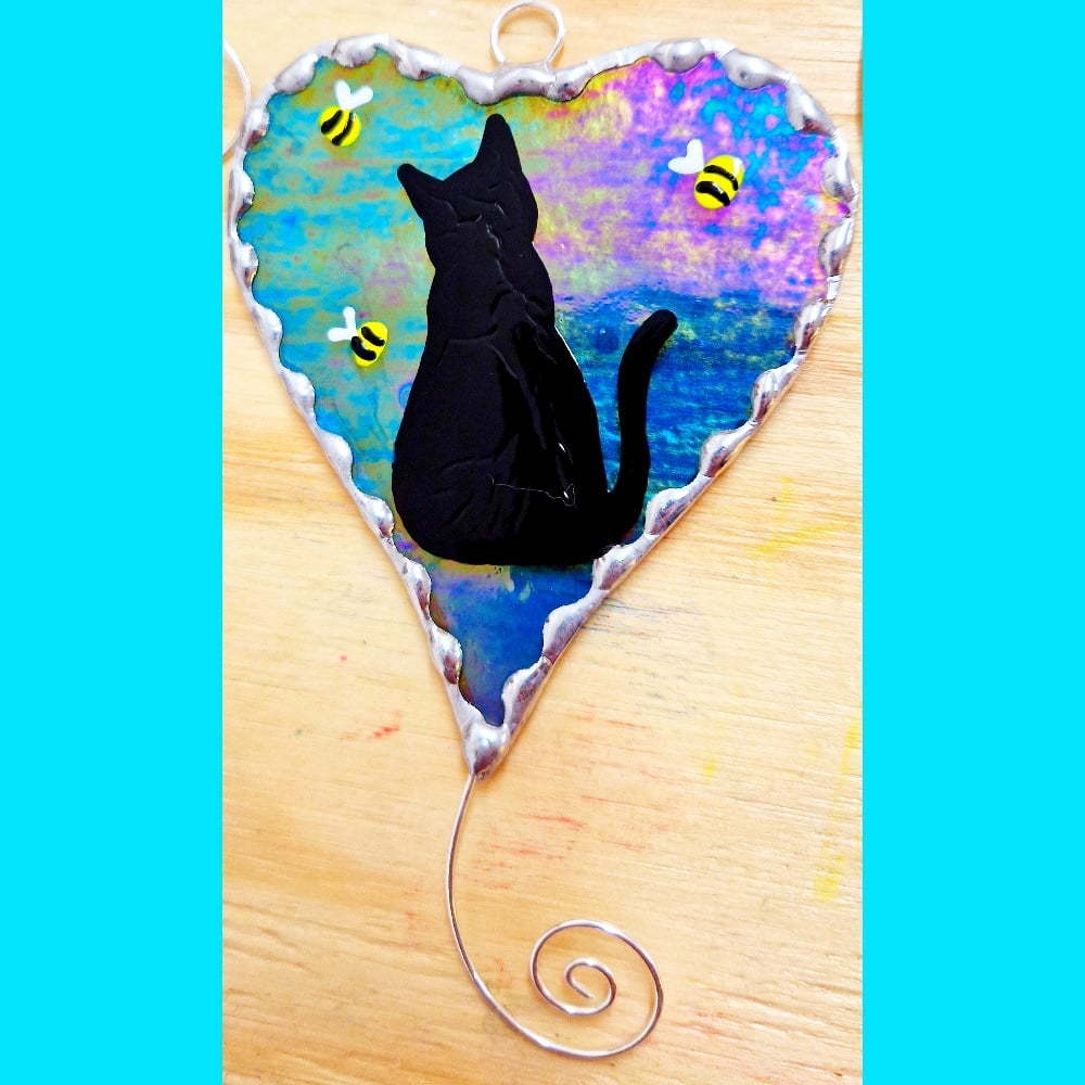 Stained Glass Iridescent Aqua Heart, with Handpainted Black Cat Silhouette and Bees. Approximately 7cm x 9cm.